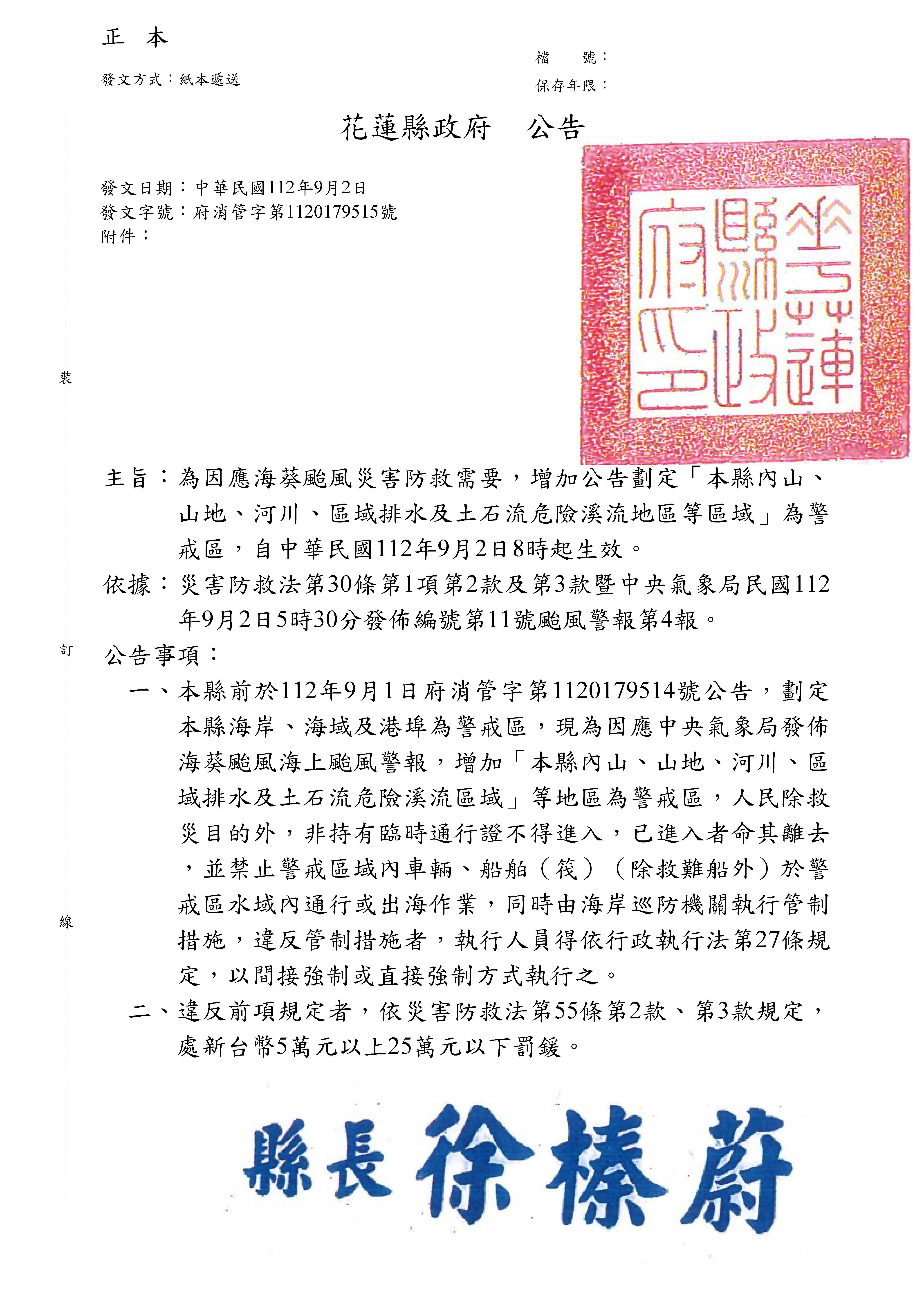 為因應海葵颱風災害防救需要,公告劃定『本縣海岸、海港及港埠』等區域範圍為警戒區,自中華民國112年9月2日8時起生效。