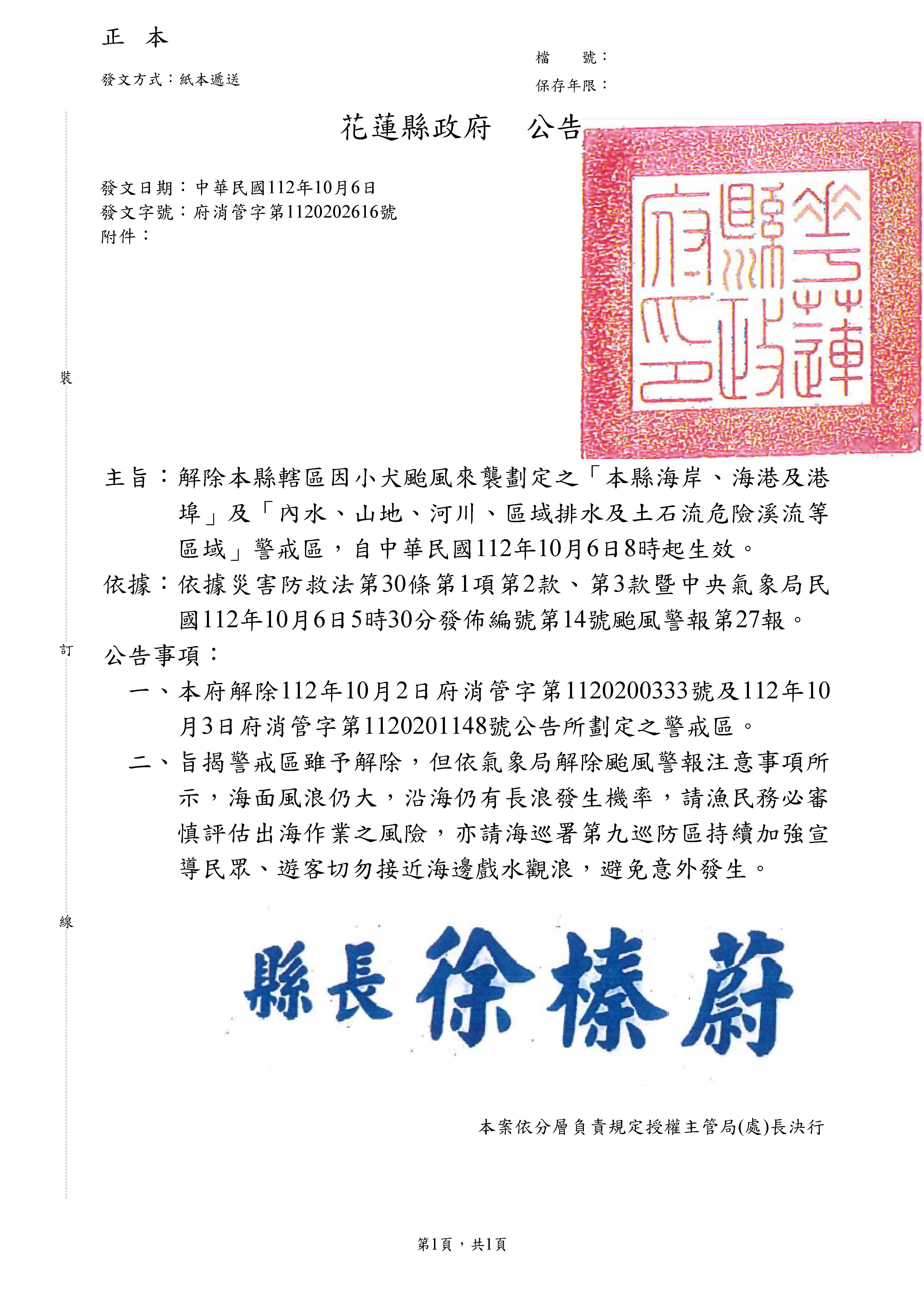 解除本縣轄區因小犬颱風災害劃定之「本縣海岸、海港及港埠」及「內水、山地、河川、區域排水及土石流危險溪流地區」警戒區,自中華民國112年10月6日8時起生效。
