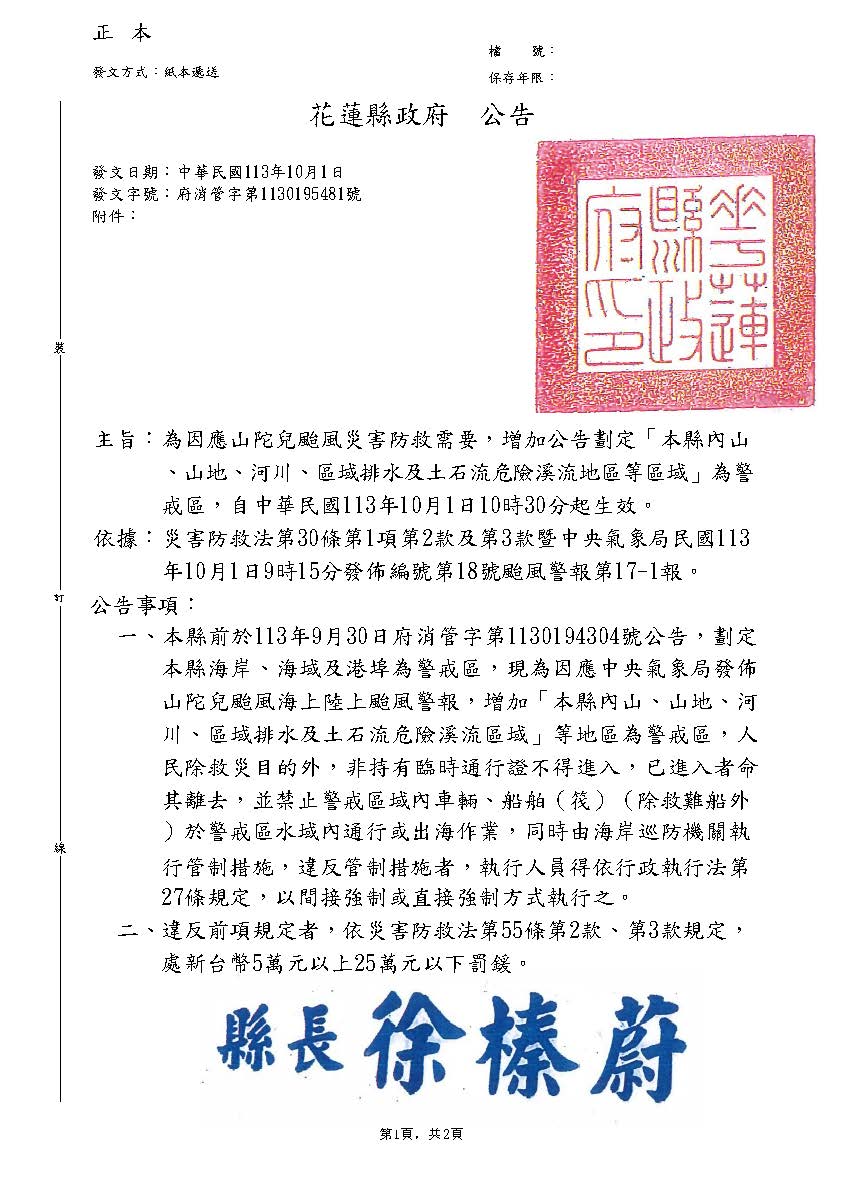 為因應山陀兒颱風災害防救需要,公告劃定『本縣海岸、海港及港埠』自中華民國113年9月30日08時起生效、「本縣內水、山地、河川、區域排水及土石流危險溪流地區等區域」警戒區,自中華民國113年10月1日10時30分起生效。