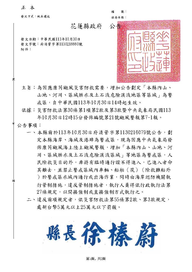 為因應康芮颱風災害防救需要,公告劃定『本縣內山、 山地、河川、區域排水及土石流危險溪流地區等區域』等區域範圍為警戒區,自中華民國113年10月30日14時起生效。